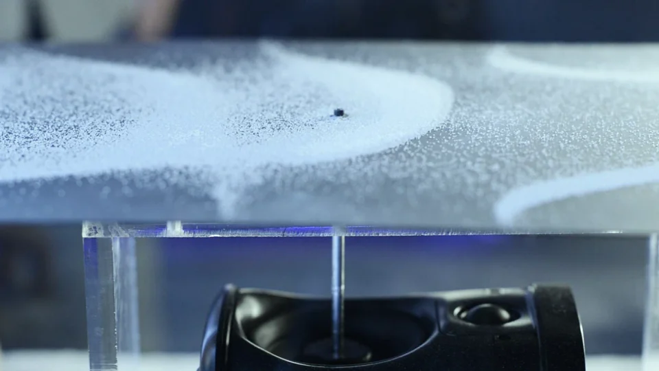 A non-Newtonian fluid experiment visualized mid and high frequencies from the soundbar, while a custom water tray revealed the raw power of the subwoofer.